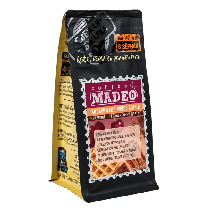 Плантационный кофе Madeo из Танзании, выращенный на склонах Килиманджаро. Натуральная (сухая) обработка придаёт зернам выраженную сладость и плотное, бархатистое тело. Вкус насыщен нотами свежих вафель и горького шоколада с сочными оттенками спелой вишни и тёмного винограда.