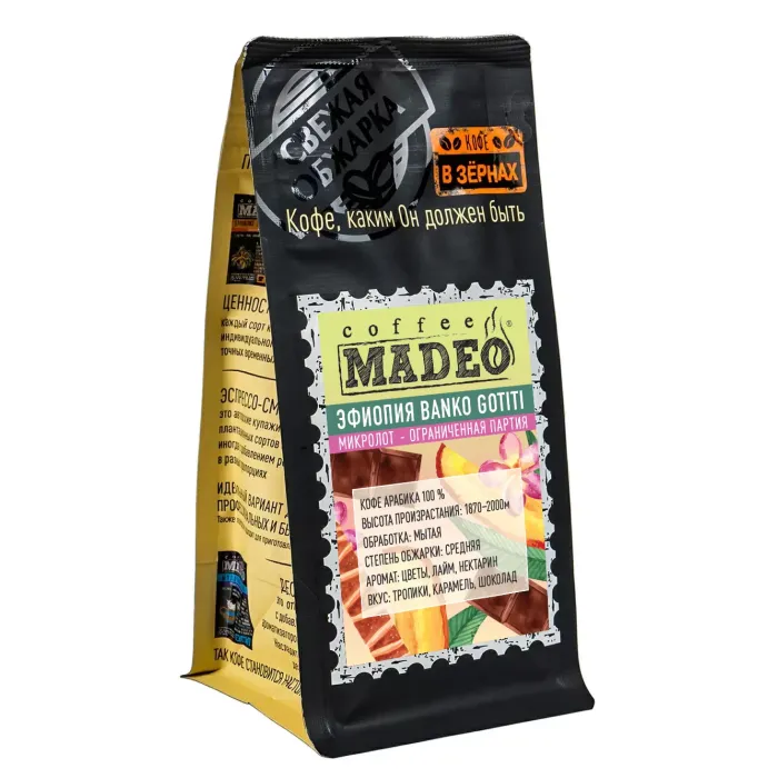 Плантационный кофе Madeo из эфиопского региона Гедьо. Выращен на высоте 1870–2000 метров, что способствует формированию сложного вкусового профиля. Во вкусе раскрываются ноты тропических фруктов, карамели и шоколада, а аромат отличается цветочно-цитрусовыми оттенками.
