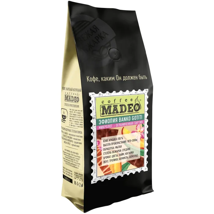 Плантационный кофе Madeo из Эфиопии, региона Гедэо, выращен на высоте до 2000 метров. Мытая обработка (Washed) раскрывает утончённый и сложный профиль с яркой фруктовостью. Средняя обжарка сохраняет баланс, подчёркивая ноты тропических фруктов, карамели и мягкого шоколада.