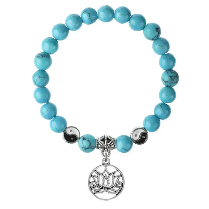 Браслет с подвеской в виде лотоса, выполненный из синтетической бирюзы и бижутерного сплава.