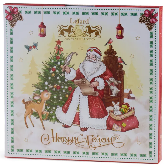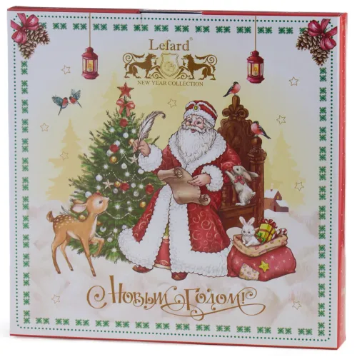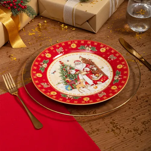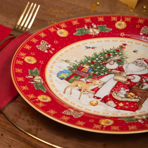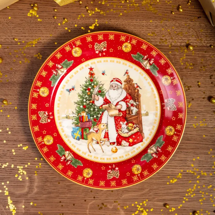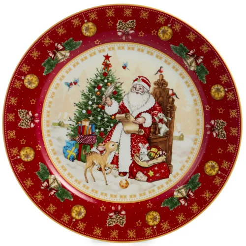 Тарелка выполнена из высококачественного фарфора, что обеспечивает её прочность и гигиеничность. Продукция имеет соответствующие сертификаты для контакта с пищевыми продуктами. Декоративное изображение Деда Мороза и новогодней елки нанесено методом деколи.