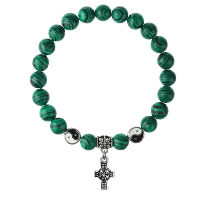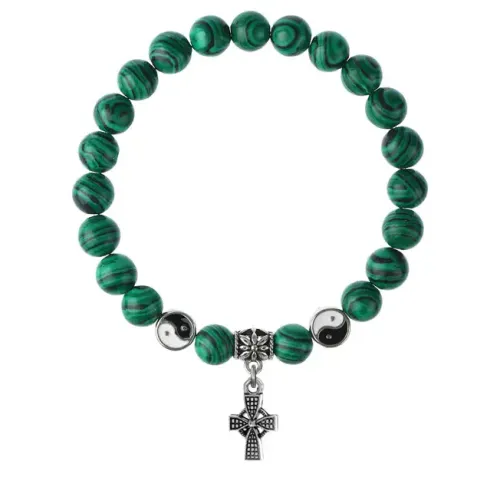 Браслет из синтетического малахита с подвеской в виде креста из бижутерного сплава.