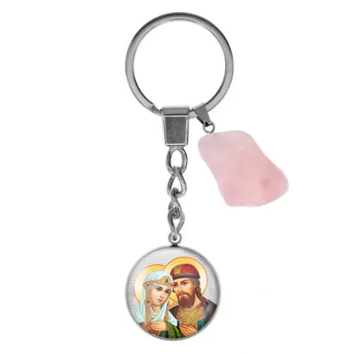 Брелок из нерж. стали Петр и Феврония с нат. камнем Розовый кварц BKM-075