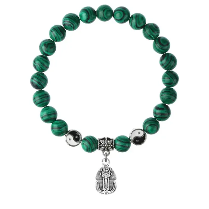 Браслет из синтетического малахита с подвеской-талисманом в виде фараона.