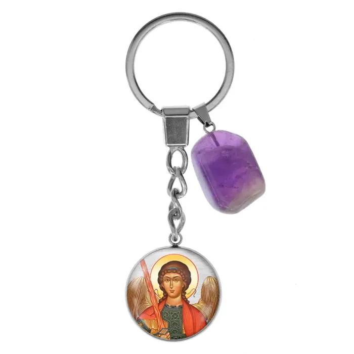 Брелок из нержавеющей стали с изображением архангела Михаила и натуральным камнем аметист.
