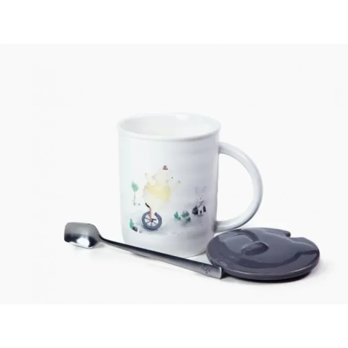 Фарфоровая кружка с ложкой и крышкой Медведи-циркачи, серая 350 мл