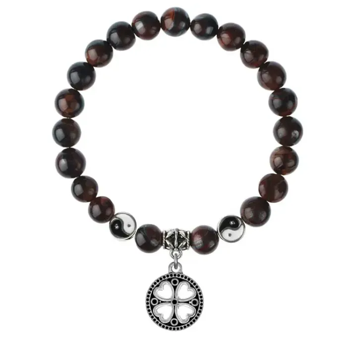 Браслет из натурального камня бычий глаз с подвеской в виде клевера.