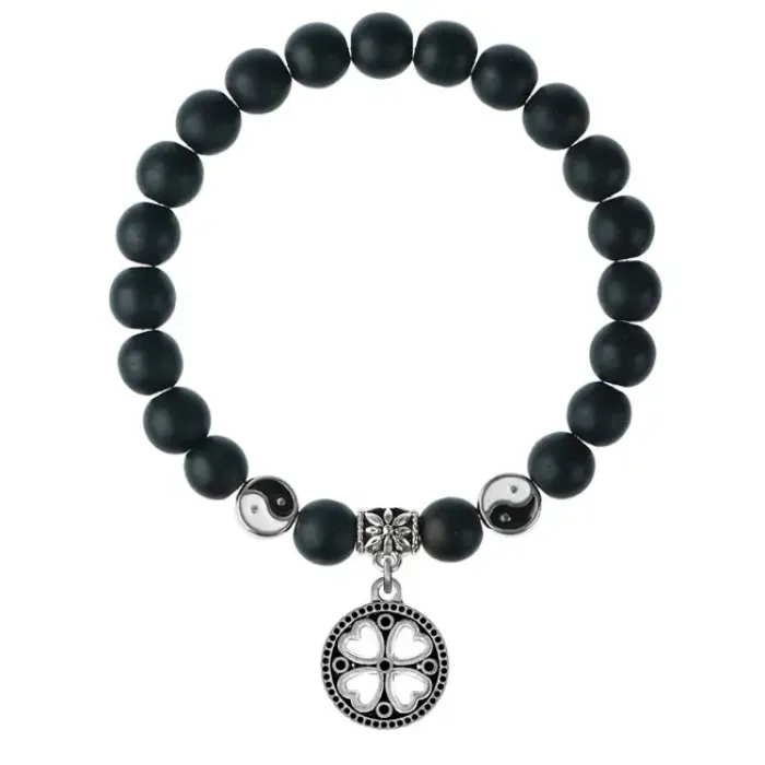 Браслет из синтетического шунгита с подвеской в виде клевера.