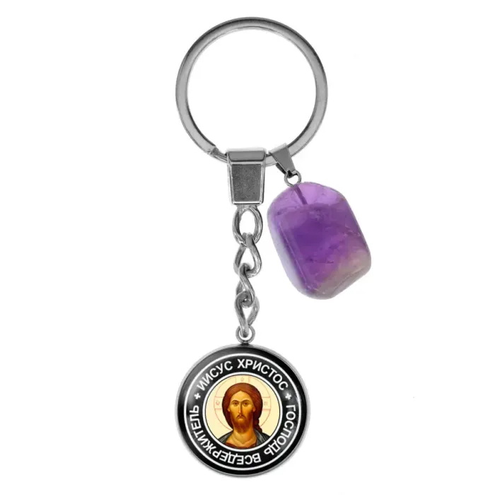 Брелок из нержавеющей стали с изображением Господа Вседержителя и натуральным камнем аметист — это не только стильный аксессуар, но и символ защиты и помощи. Изображение Спасителя приносит мир и спасение от несчастий, лжи и огорчений. Каждый камень уникален благодаря галтовке, что делает каждый брелок по-своему неповторимым.
