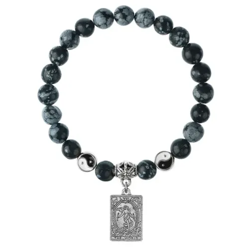 Браслет из натурального снежного обсидиана с подвеской-талисманом в виде аркана Таро «Мир».