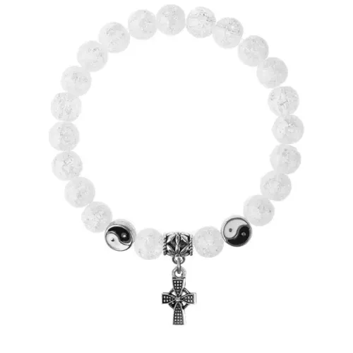 Браслет-амулет из синтетического сахарного кварца с подвеской в виде креста из бижутерного сплава.