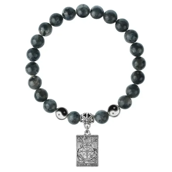 Браслет с подвеской в виде карты Таро «Колесо Фортуны». Изготовлен из натурального камня лабрадор и бижутерного сплава.