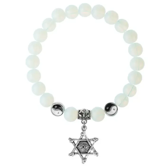 Браслет-амулет из синтетического опалита (лунного камня) с подвеской из бижутерного сплава.