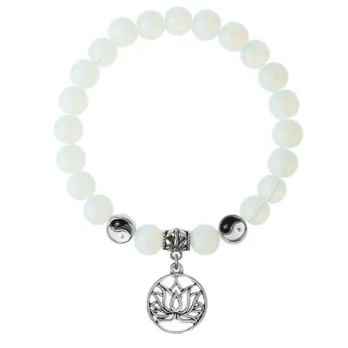 Браслет из синтетического лунного камня (опалита) с подвеской-талисманом в виде лотоса.