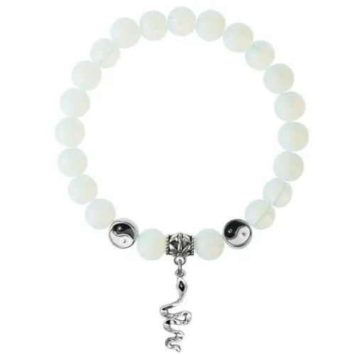 Браслет-амулет из синтетического лунного камня (Опалит) с подвеской в виде змеи из бижутерного сплава.