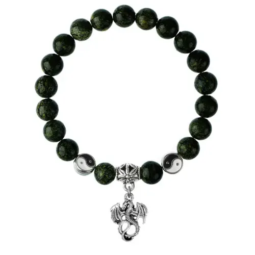 Браслет из натурального камня змеевик с бусинами 8 мм и подвеской-талисманом в виде дракона.