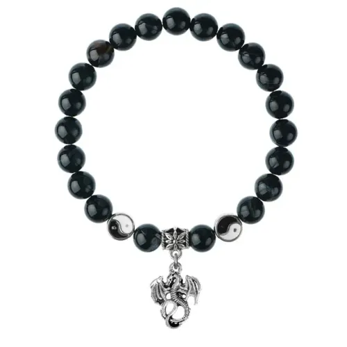 Браслет из натурального чёрного агата с подвеской в виде дракона.