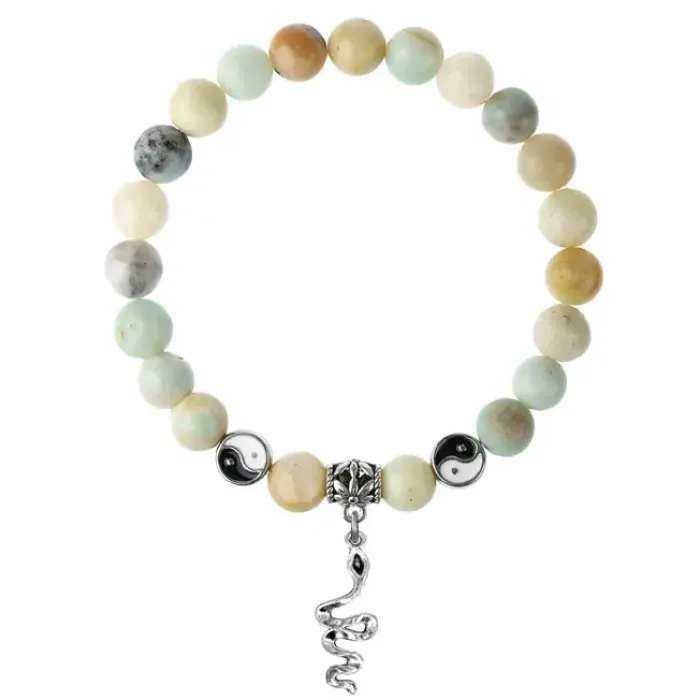 Браслет из натурального амазонита с подвеской-талисманом в виде змеи из бижутерного сплава.