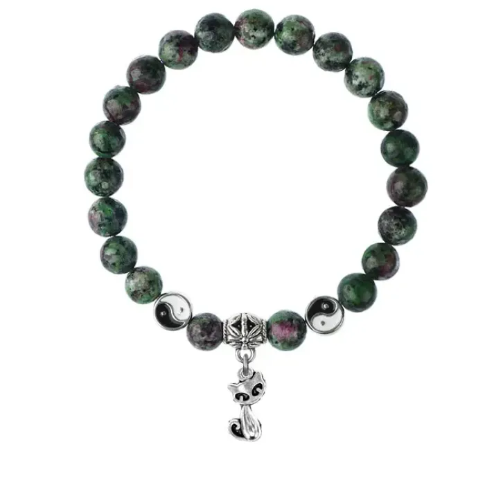 Браслет-амулет из камня цоизит с подвеской в виде кошки из бижутерного сплава.