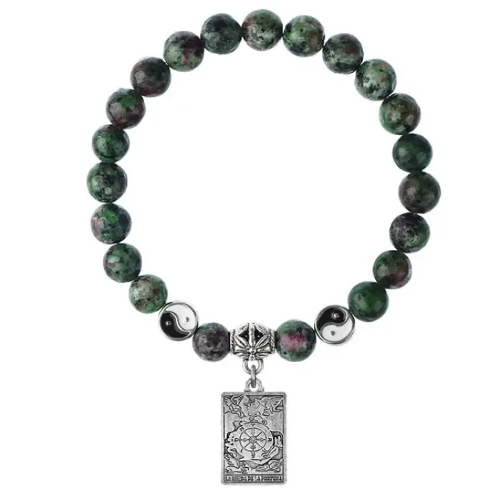 Браслет из синтетического цоизита с подвеской в виде символа Колесо Фортуны.