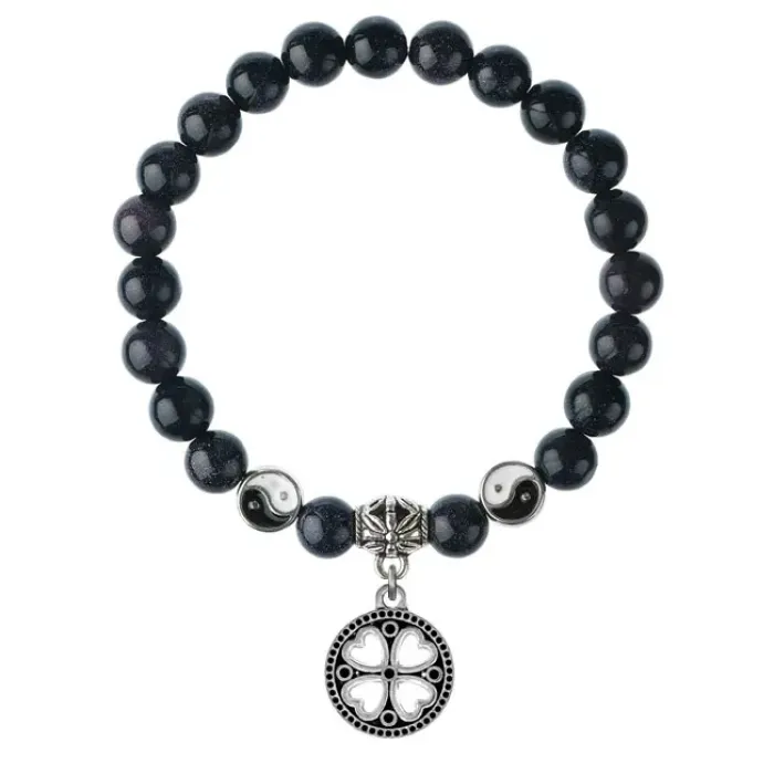 Браслет из синтетического синего авантюрина с подвеской-талисманом в виде клевера.