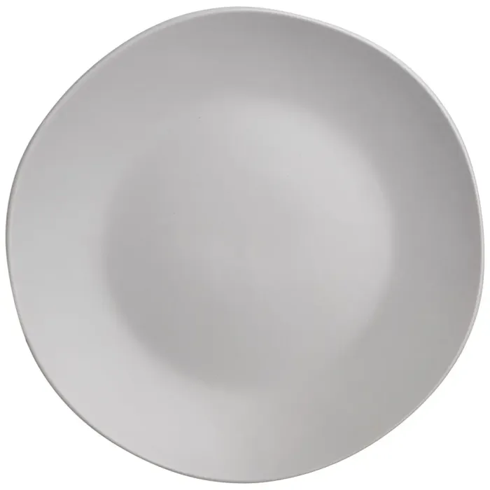 Тарелка выполнена из керамики, обожжённой при высоких температурах, что повышает её устойчивость к механическим повреждениям и перепадам температур. Поверхность покрыта матовой глазурью светло-серого цвета. Конструкция имеет оригинальную неправильную форму, а керамическая основа гарантирует гигиеничность и безопасность при контакте с пищевыми продуктами.