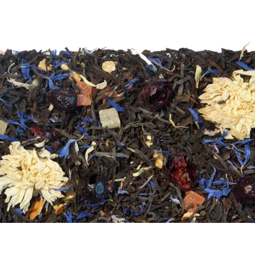 Состав: Чай черный рассыпной листовой крупный, цукаты ананаса (ананас, сахар, лимонная кислота), ягоды черной смородины, цедра апельсина, ароматизаторы, лепестки василька, цветы хризантемы.