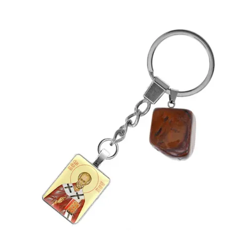 Брелок из нержавеющей стали Свт. Николай Чудотворец с натуральным камнем Тигровый глаз BKM-ALE302