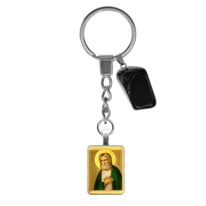 Брелок из нержавеющей стали с изображением Святого Преподобного Серафима Саровского и натуральным камнем Черный агат — это не только стильный аксессуар, но и символ защиты и благополучия. Святой Серафим известен своей способностью защищать от врагов, исцелять болезни и укреплять веру, а также помогать в заключении брака.