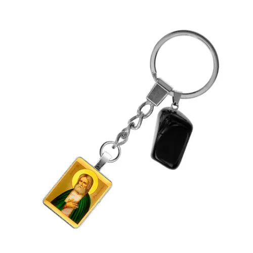 Брелок из нержавеющей стали Св.прп. Серафим Саровский с натуральным камнем Черный агат BKM-ALE303