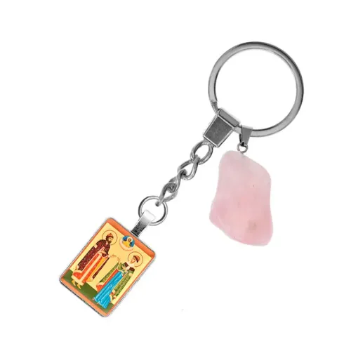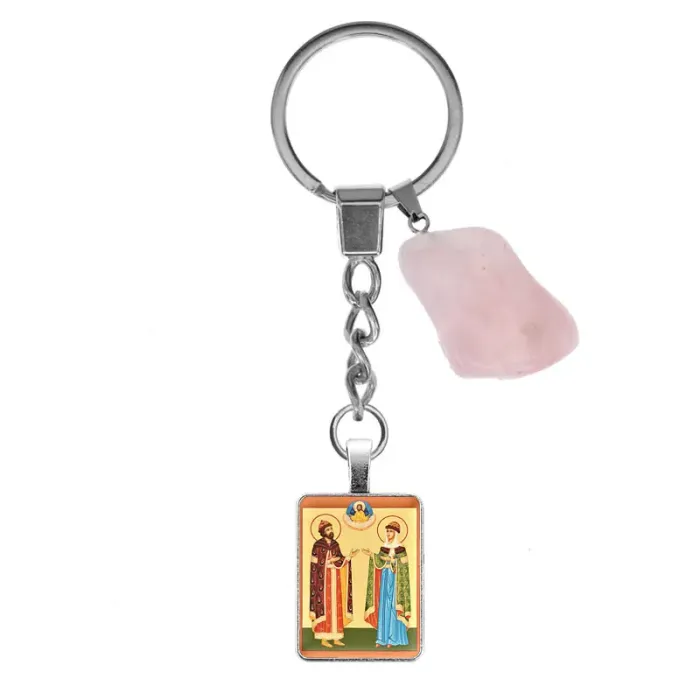 Брелок из нержавеющей стали Благоверные князь Петр и княгиня Феврония с натуральным камнем Розовый кварц BKM-ALE308