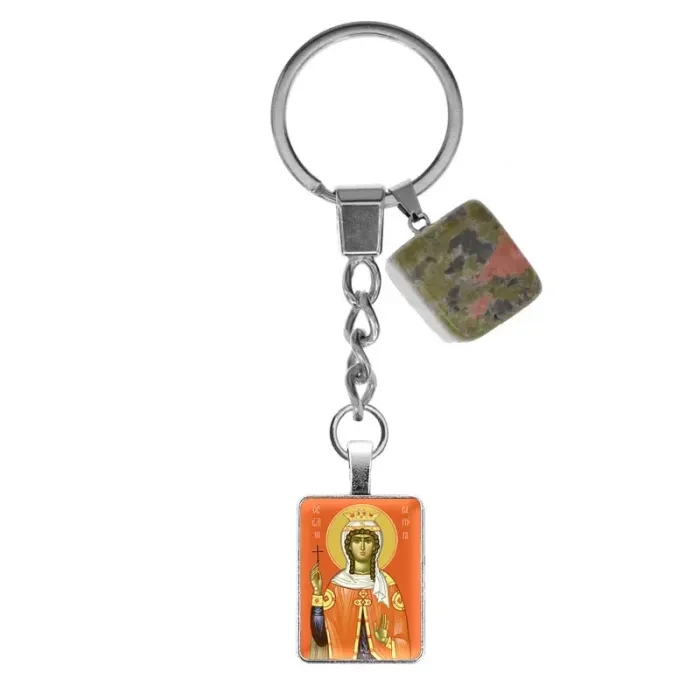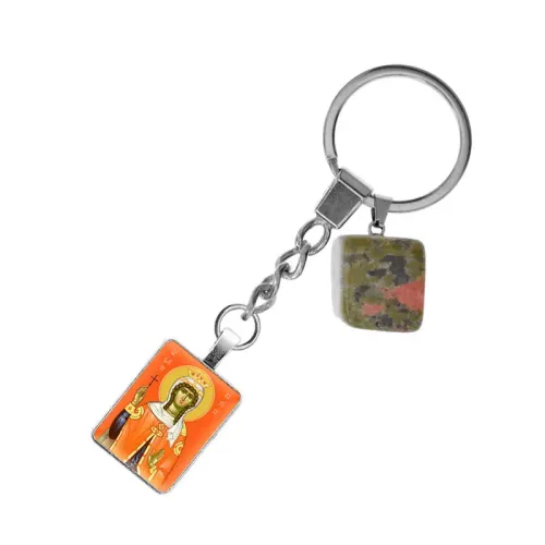 Брелок из нержавеющей стали Св. Великомученица Варвара с натуральным камнем Унакит BKM-ALE318