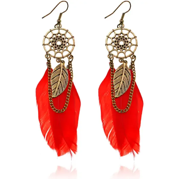 Серьги в виде ловца снов из бижутерного сплава с элементами в виде перьев и красным декором.