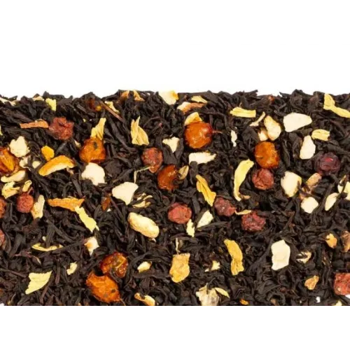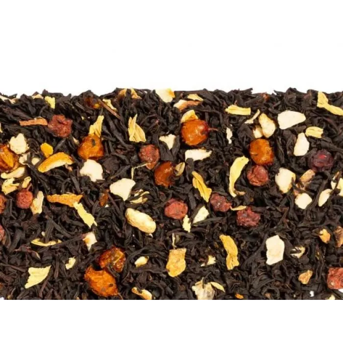 Крупнолистовой черный чай с яркими добавками ягод облепихи и цедры апельсина. Настой обладает насыщенным ароматом с преобладанием свежих цитрусовых и ягодных нот, а вкус отличается пикантностью благодаря красной рябине и цитрусовой цедре.