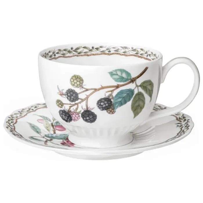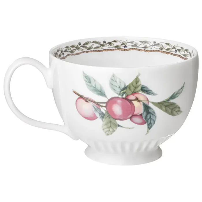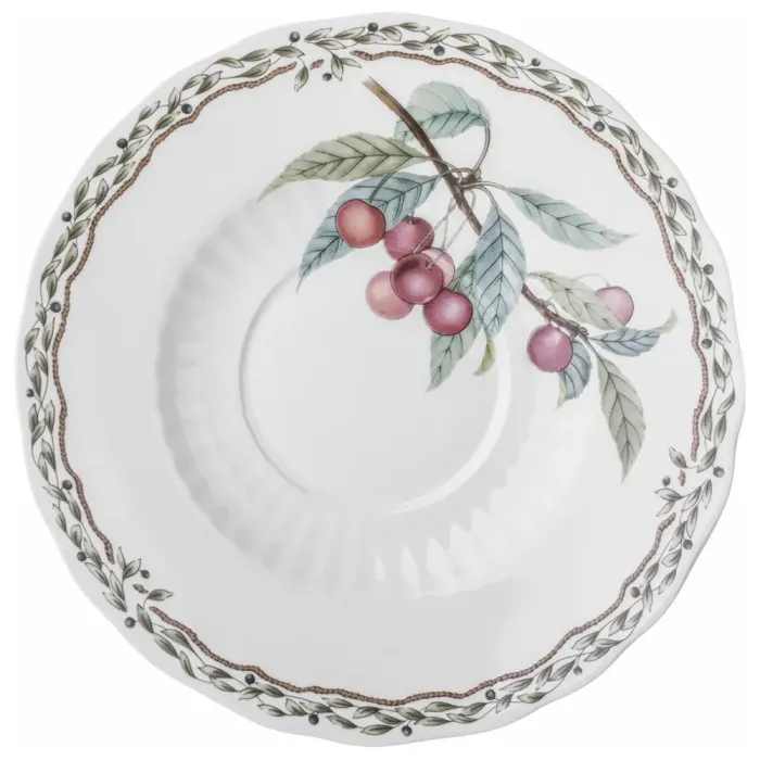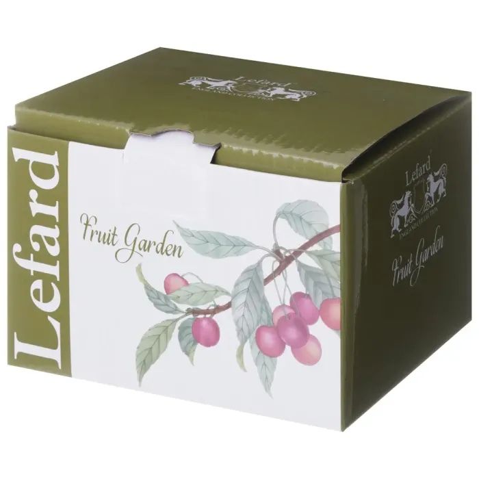 Посуда изготовлена из фарфора, который характеризуется высокой прочностью и устойчивостью к царапинам. Поверхность покрыта блестящей глазурью. Декоративное оформление включает изображения ягод и фруктов, нанесённые с применением рельефной техники.