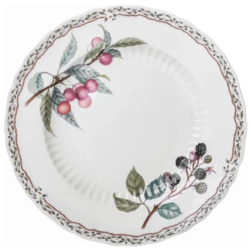 Тарелки изготовлены из фарфора, что обеспечивает прочность и гигиеничность. Поверхность покрыта глазурью, устойчивой к царапинам. Декоративный рисунок с изображением ягод и фруктов нанесён под глазурь, а края изделий имеют утончённый рельеф.