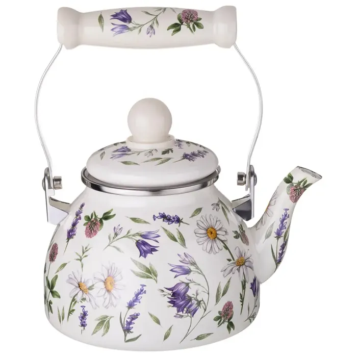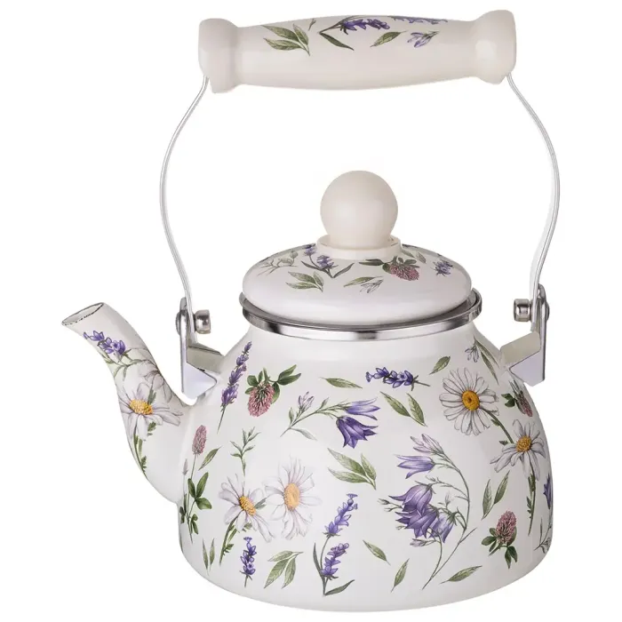 Корпус чайника изготовлен из эмалированной стали, что обеспечивает устойчивость к коррозии. Покрытие прошло трёхэтапный обжиг для повышения прочности и сохранения яркости декора. Эргономичная ручка из керамики с фиксатором и тонкие стенки толщиной 0,8 мм способствуют удобному и быстрому нагреву.