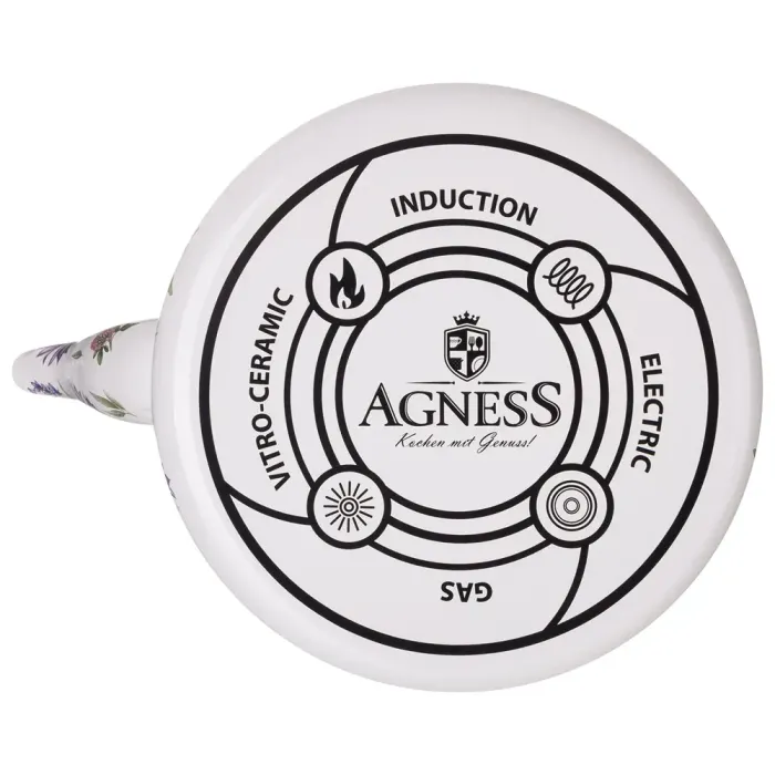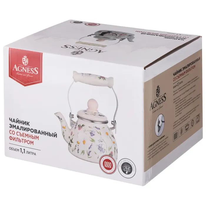Эмалированный чайник Agness серии Flower Story предназначен для кипячения воды на плите. Модель объёмом 1,1 литра оснащена съёмным фильтром из нержавеющей стали для удобства очистки и использования.
