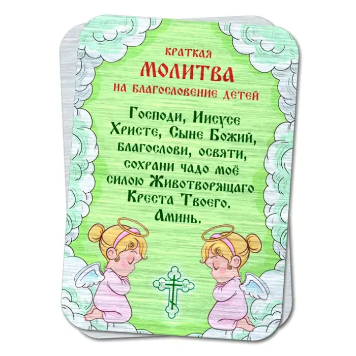 Металлическая карта с молитвой "На благословение детей" станет прекрасным подарком для родителей и их малышей. Этот сувенир, выполненный из сублимационного алюминия, символизирует заботу и защиту.