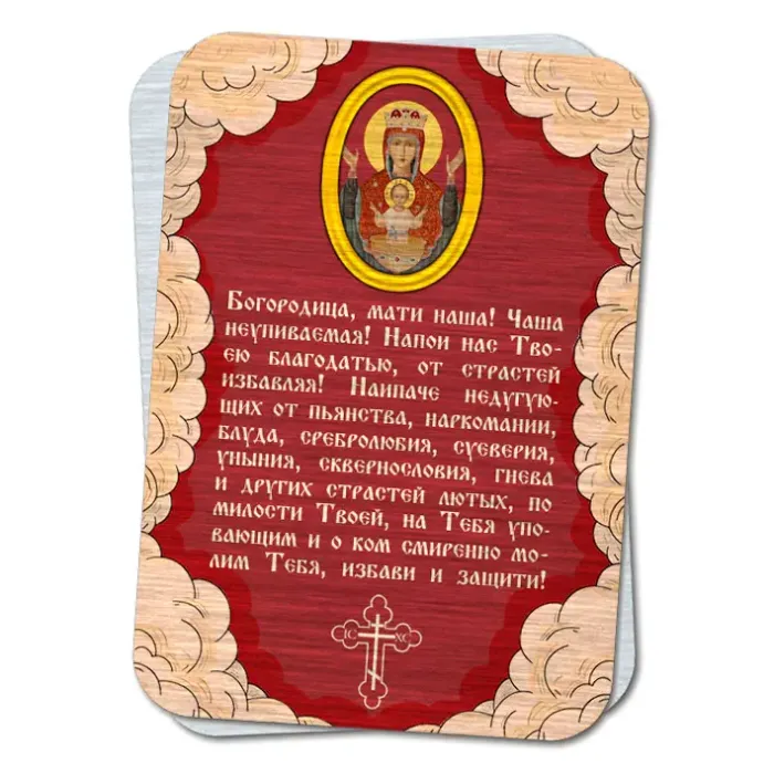 Металлическая карта с молитвой «Неупиваемая Чаша» — это уникальный сувенир, который сочетает в себе духовный смысл и эстетическую привлекательность. Изготовленная из сублимационного алюминия, она обладает высокой прочностью и долговечностью.