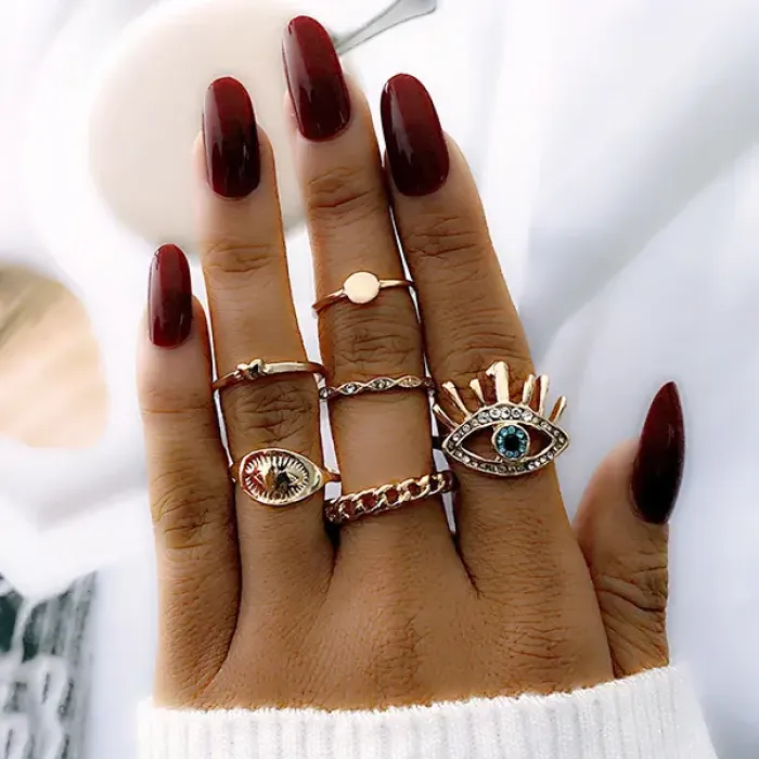 Набор из шести декоративных колец. Материал — бижутерный сплав с покрытием под золото и стразами.