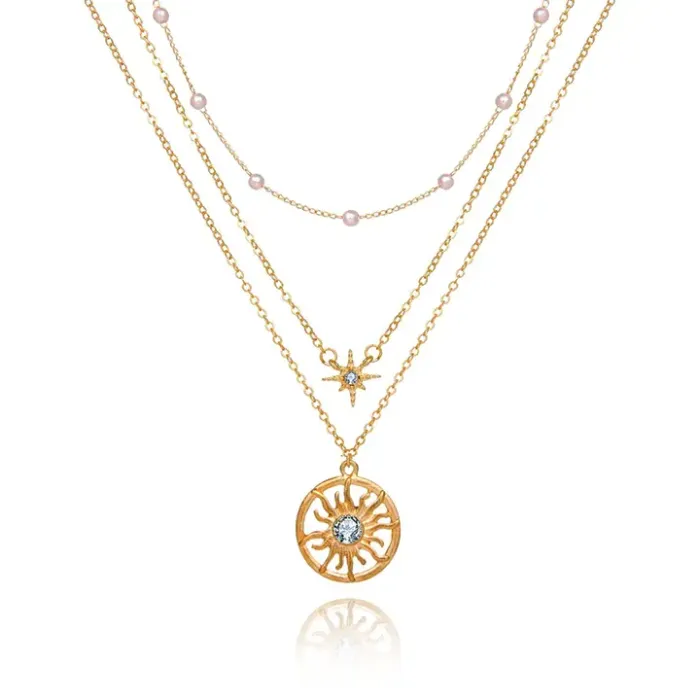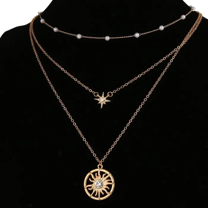 Набор из трёх кулонов в форме Солнца и звезды для ношения в качестве украшения. Материал — бижутерный сплав с золотым покрытием, декор — искусственный жемчуг и стразы.
