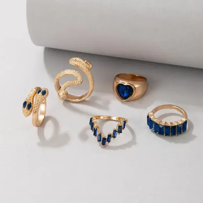 Набор из пяти сувенирных колец золотого цвета с декоративными вставками.
