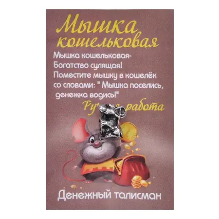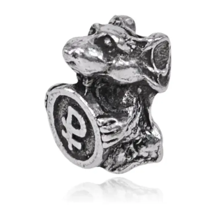 Кошельковый сувенир в виде мышки с рублём, выполненный из металла с серебряным покрытием.