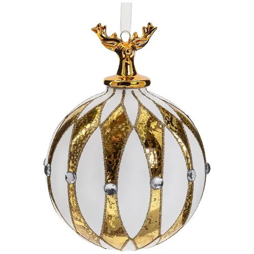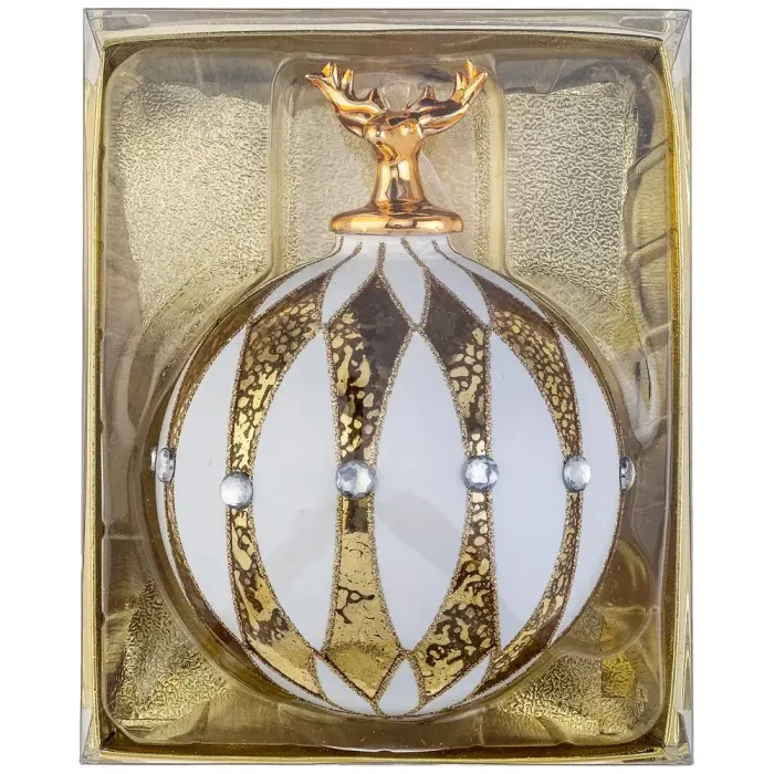 Шар выполнен из прочного стекла, что обеспечивает долговечность и сохранение первоначального вида на протяжении многих лет. Диаметр 10 см делает его заметным элементом декора, который гармонично впишется в любую композицию. Украшение легко крепится благодаря удобной петельке, позволяющей быстро разместить его на ветках елки.