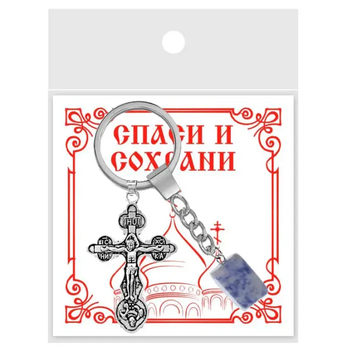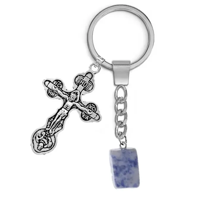 Брелок Крест с натуральным камнем Содалит — это стильный аксессуар, который сочетает в себе красоту и символику. Натуральный камень, обладающий уникальной формой благодаря галтовке, делает каждый брелок неповторимым. Изготовленный из бижутерного сплава и нержавеющей стали, он отличается прочностью и долговечностью.