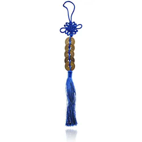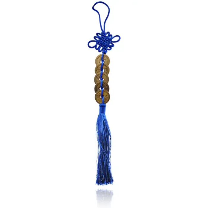 Подвеска Фэн-Шуй Пять Монет и Узел, 30см, цвет синий FEP024-08