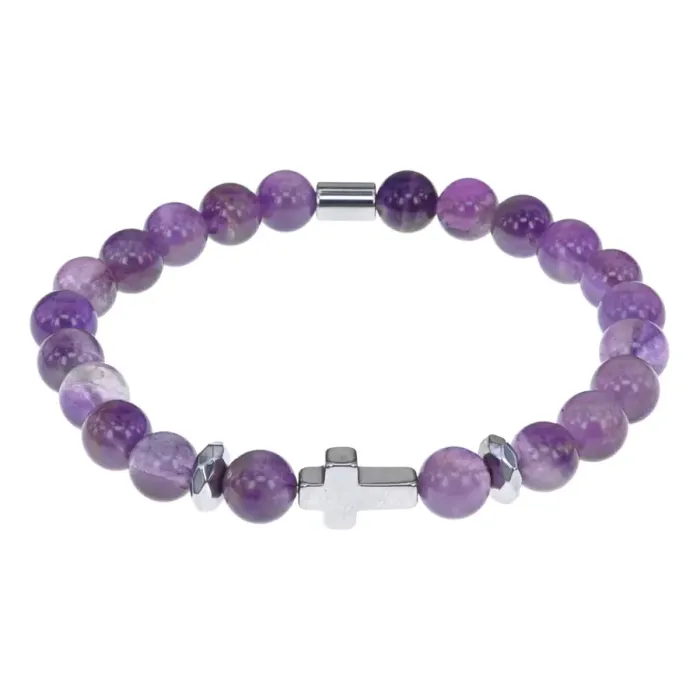 Христианский браслет Крест с нат.камнем Аметист 8мм BSH-14-03