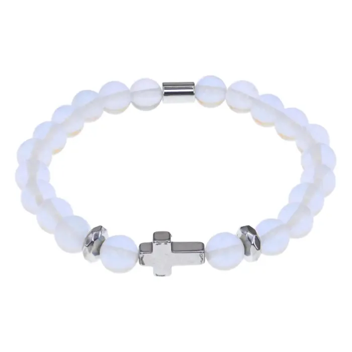 Христианский браслет Крест с синт.камнем Лунный камень 8мм BSH-14-11