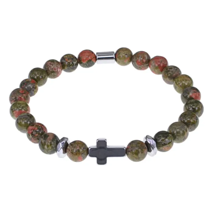 Христианский браслет Крест с нат.камнем Унакит 8мм BSH-14-20
